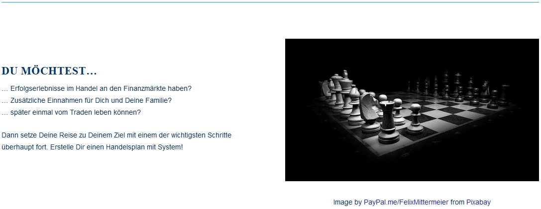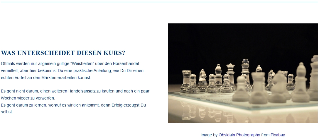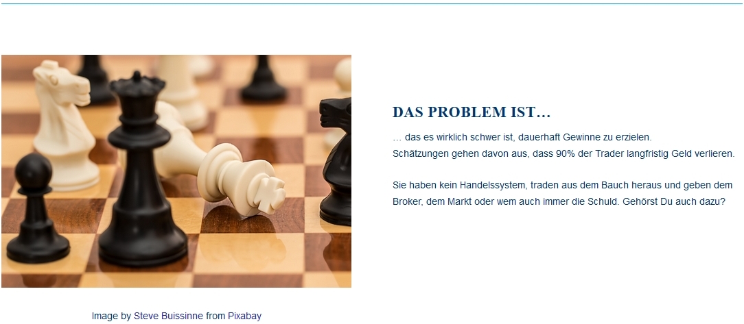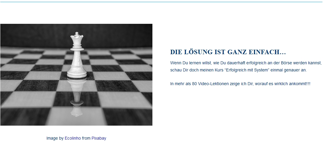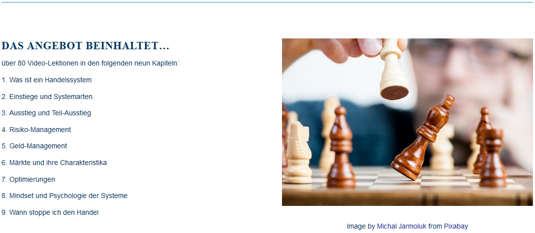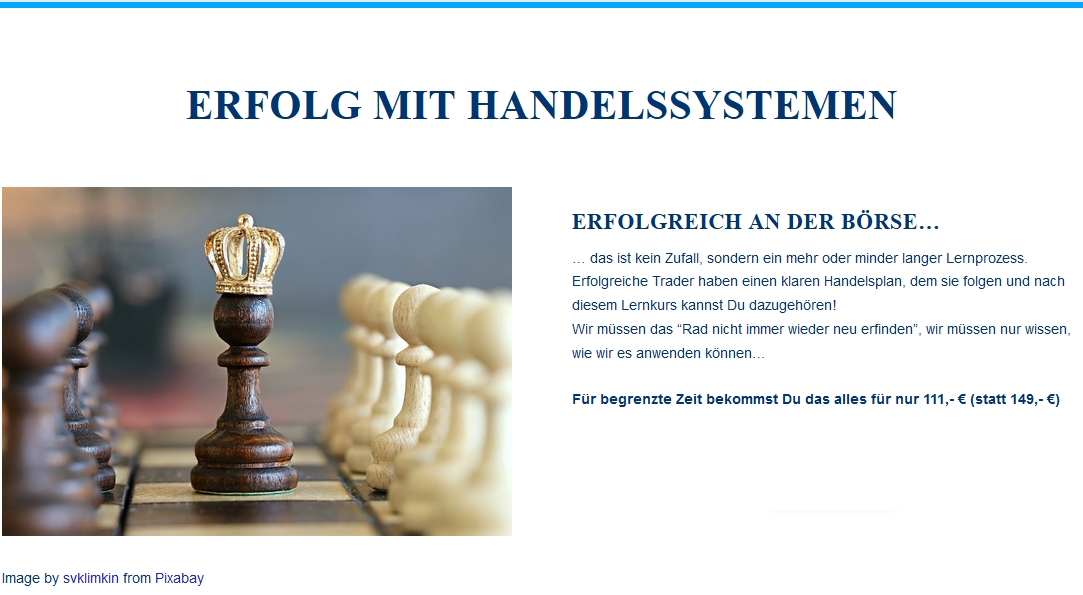 Der Kurs "erfolgreich mit Handelssystemen“ stellt gut aufbereitet die wesentlichen Eigenschaften von Handelssystemen dar und zeigt, wie man sie erfolgreich nutzt. Neben dem Trading im engeren Sinne geht es dabei um Risikobetrachtungen, Money Management und Psychologie - und dass diese Aspekte für dauerhaften Erfolg vielleicht die Entscheidenden sind.