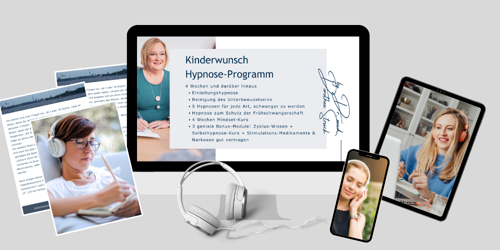 Sie arbeiten intensiv 4 Wochen mit Hypnose, einem Mindset-Kurs und vielem mehr und wenn Sie noch nicht gleich schwanger sind, erhalten Sie eine Anleitung, wie Sie mit den Materialien des Kinderwunsch-Hypnose-Programms weiterarbeiten, um Ihre Fruchtbarkeit weiter zu verbessern.