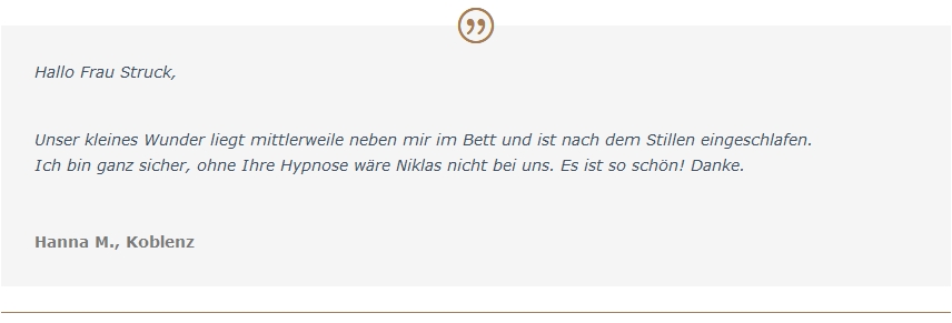 Eigentlich habe ich nie geglaubt, Hypnose könne irgendetwas bewirken, aber die vielen positiven Anekdoten, die Sie parat hatten und die Möglichkeit, die Sitzung für wenig Geld komfortabel von zu Hause aus zu machen, haben mich überzeugt. Und ja, vier Wochen später glaube ich tatsächlich, mit meinem Unterbewusstsein, meiner Hypophyse und meinen Eierstöcken kommunizieren zu können! Ergebnis in dem Zyklus (mit Clomifen): 2 wunderbare Follikel an Zyklustag 16 - die letzten Versuche brachten immer nur einen und den erst an Tag 21.